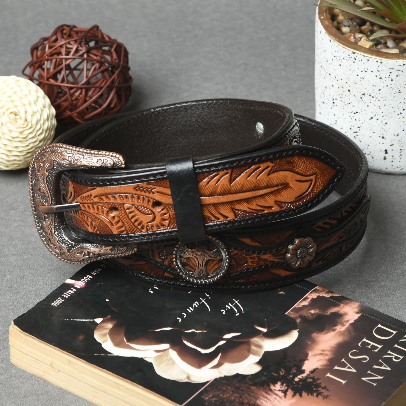 Premium Basket Textured Leather Belt - Decorative Buckle Design